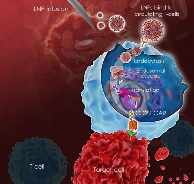 Ex vivo chimeric antigen receptor (CAR) T cell therapy has proven successful in patients with B cell hematologic malignancies. However, current approaches are limited by the requirement for personal manufacturing processes and by barriers such as limited efficacy against solid tumors, treatment-associated toxicities, insufficient CAR-T cell trafficking to the tumor microenvironment, on-target off-tumor effects, and tumor antigen escape. Here, we describe a novel delivery platform that overcomes many of these barriers by employing targeted lipid nanoparticles (LNPs) to reprogram circulating human T cells in vivo. Using a NANOBODY®-based targeting moiety, we deliver mRNA encoding a novel CD22 CAR specifically to CD8+ cells, enabling transient functional CAR expression in vitro and in vivo.